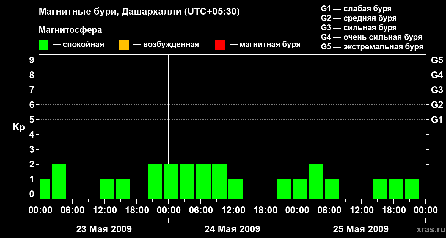 Изменения геомагнитного индекса Kp с 23 по 25 мая 2009 года для средних широт