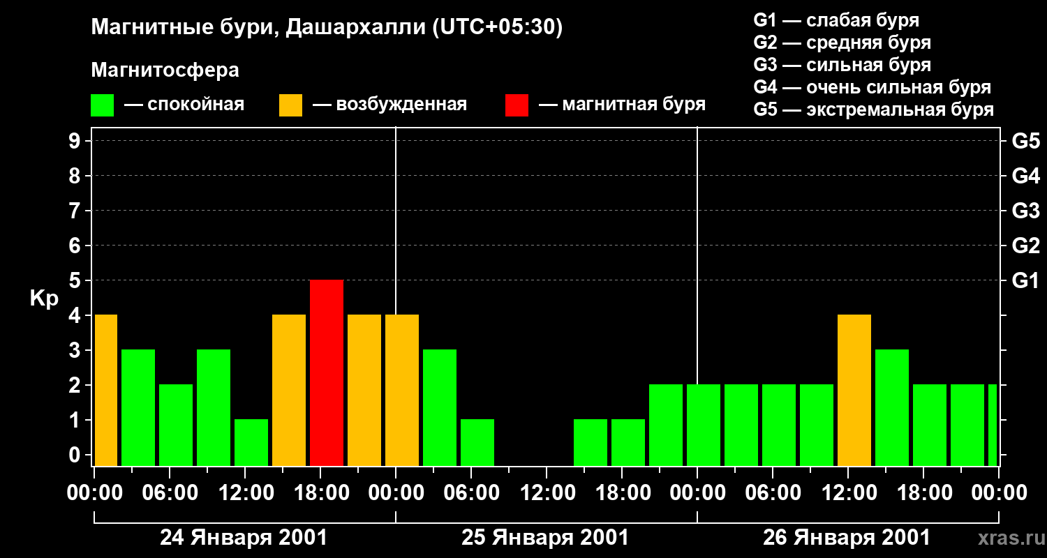 Изменения геомагнитного индекса Kp с 24 по 26 января 2001 года для средних широт