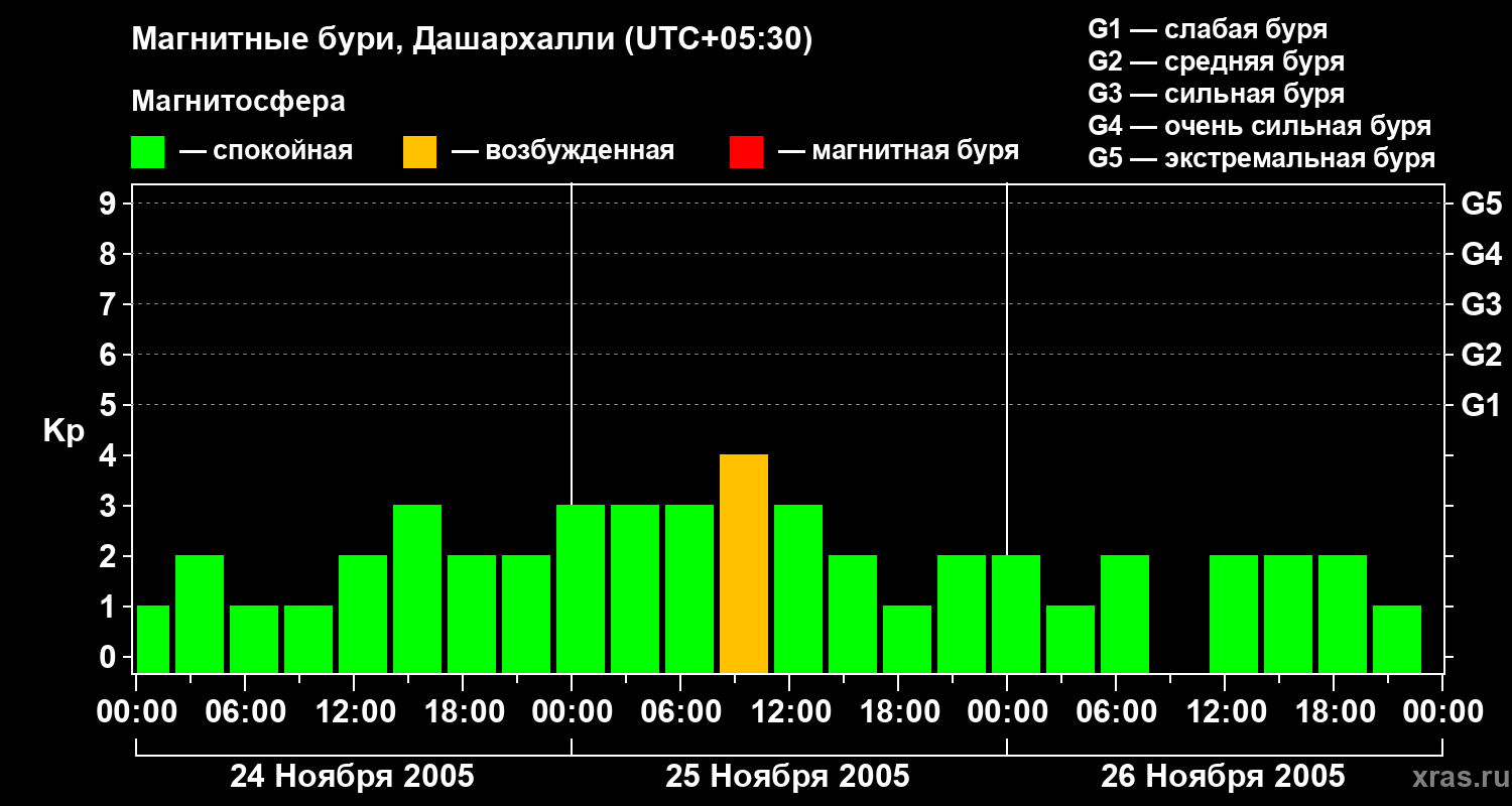 Изменения геомагнитного индекса Kp с 24 по 26 ноября 2005 года для средних широт