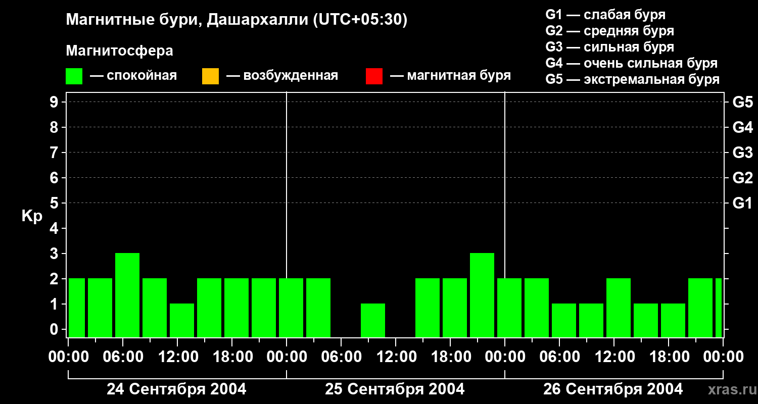 Изменения геомагнитного индекса Kp с 24 по 26 сентября 2004 года для средних широт