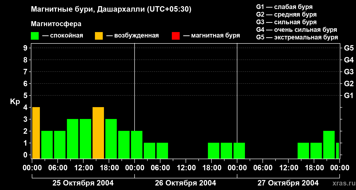 Изменения геомагнитного индекса Kp с 25 по 27 октября 2004 года для средних широт