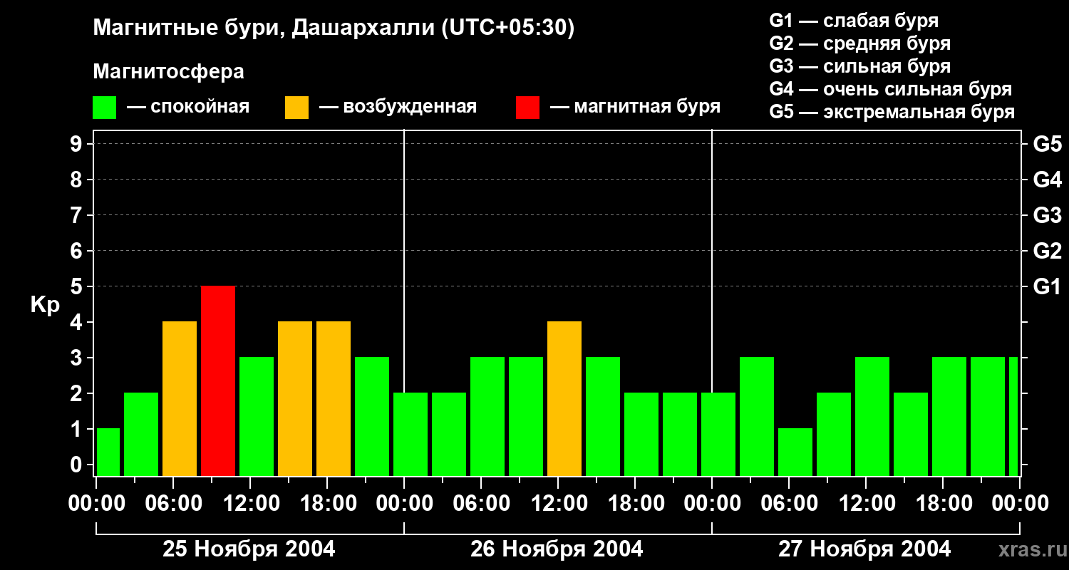 Изменения геомагнитного индекса Kp с 25 по 27 ноября 2004 года для средних широт