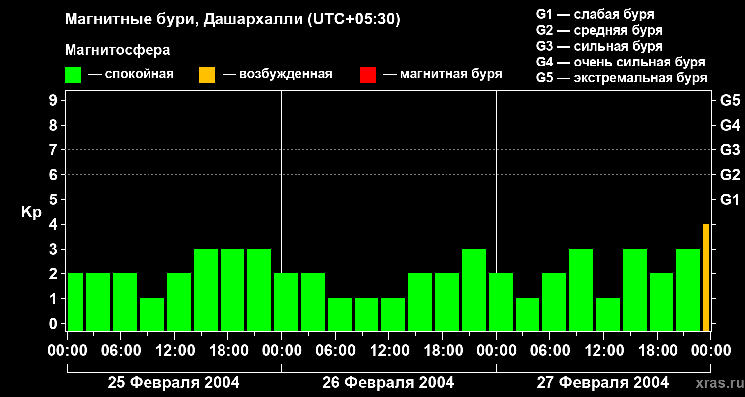Изменения геомагнитного индекса Kp с 25 по 27 февраля 2004 года для средних широт