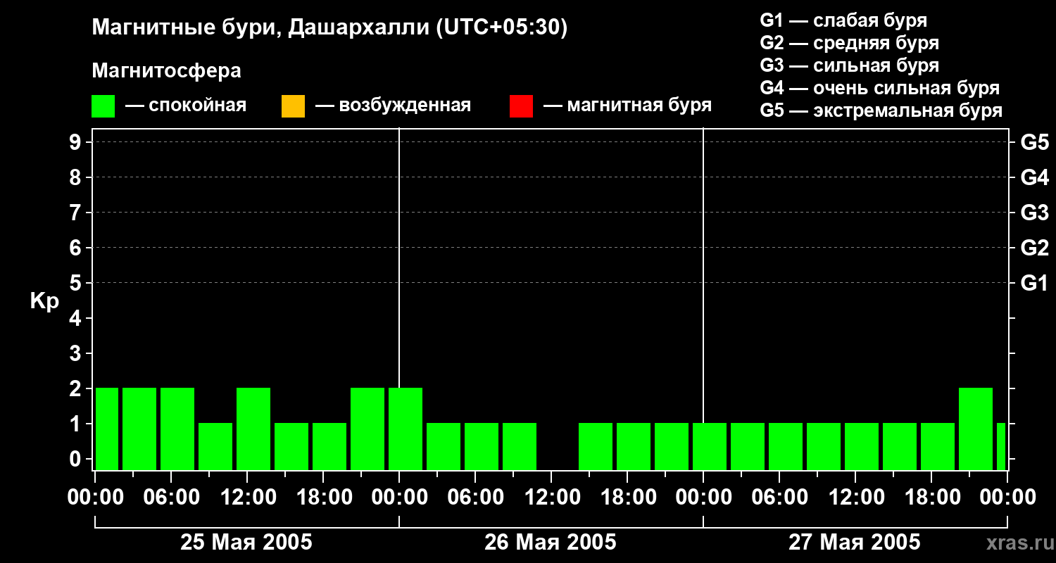 Изменения геомагнитного индекса Kp с 25 по 27 мая 2005 года для средних широт