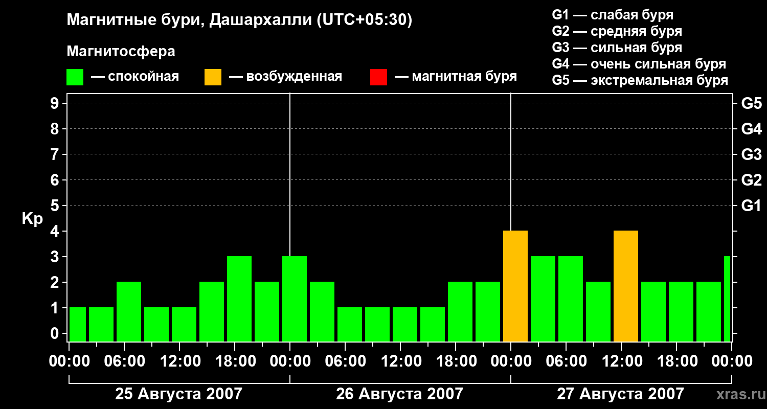 Изменения геомагнитного индекса Kp с 25 по 27 августа 2007 года для средних широт