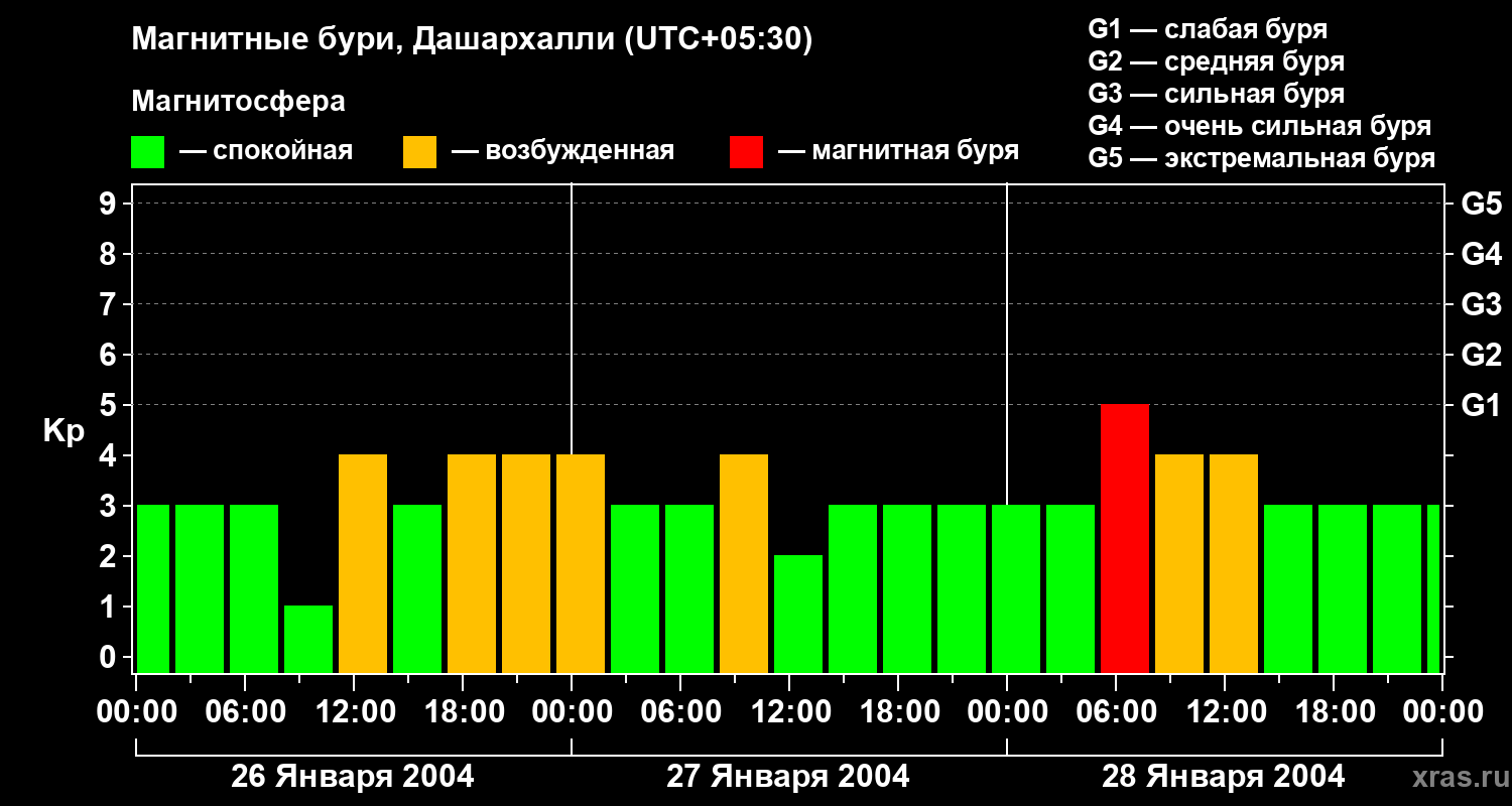Изменения геомагнитного индекса Kp с 26 по 28 января 2004 года для средних широт