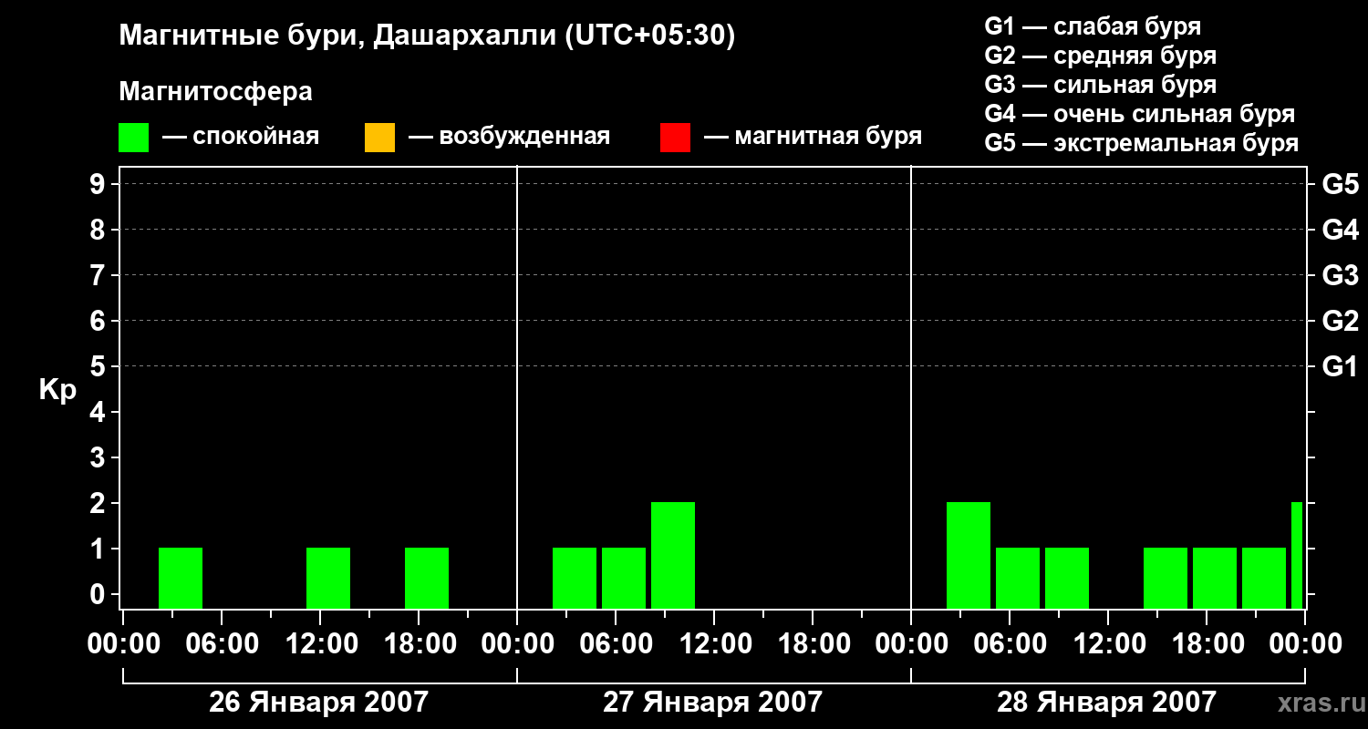 Изменения геомагнитного индекса Kp с 26 по 28 января 2007 года для средних широт