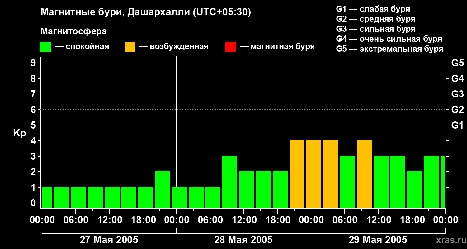 Изменения геомагнитного индекса Kp с 27 по 29 мая 2005 года для средних широт