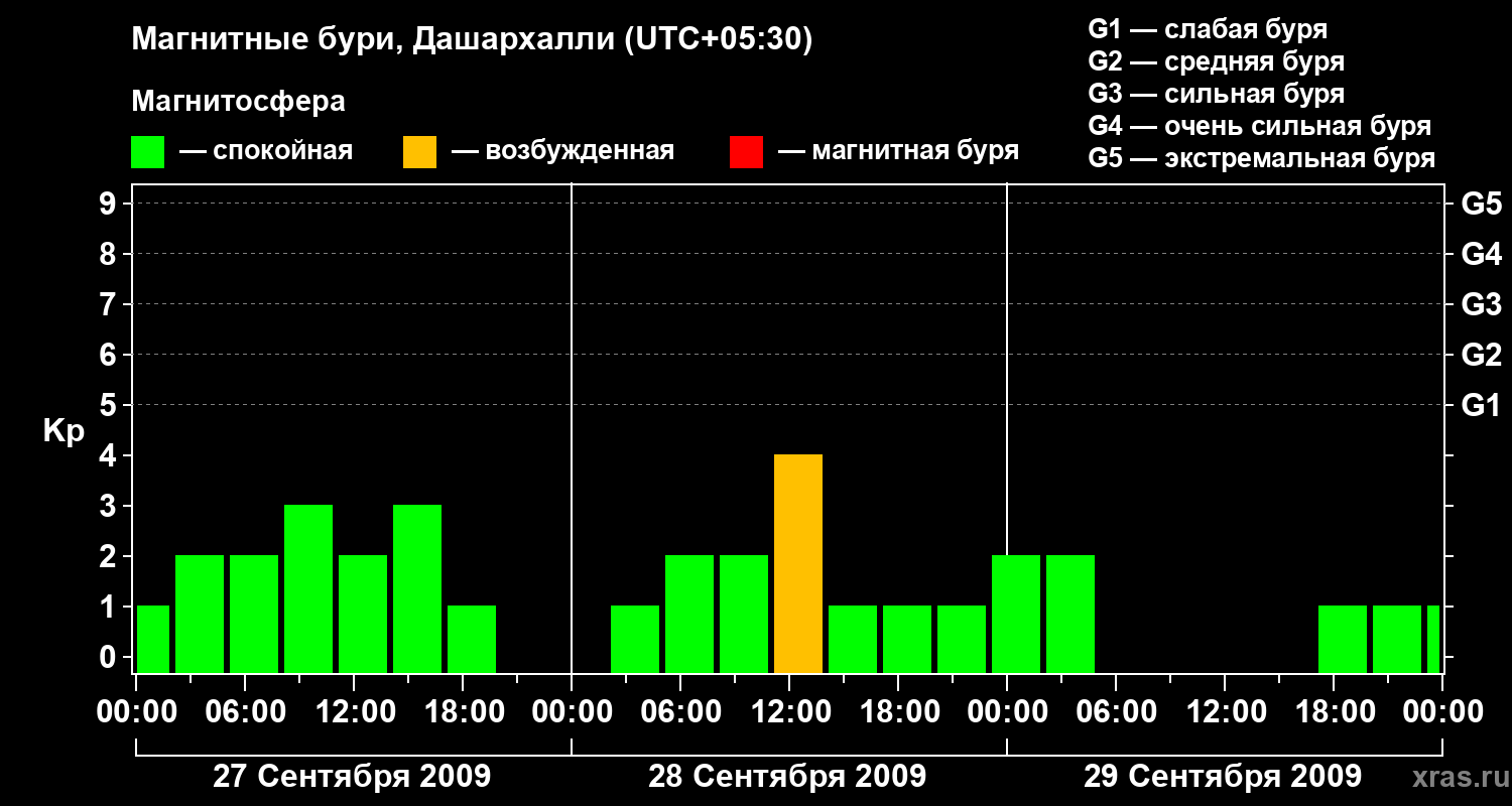 Изменения геомагнитного индекса Kp с 27 по 29 сентября 2009 года для средних широт