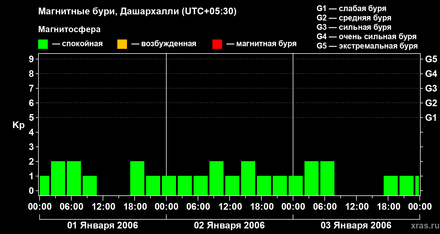 Изменения геомагнитного индекса Kp с 1 по 3 января 2006 года для средних широт