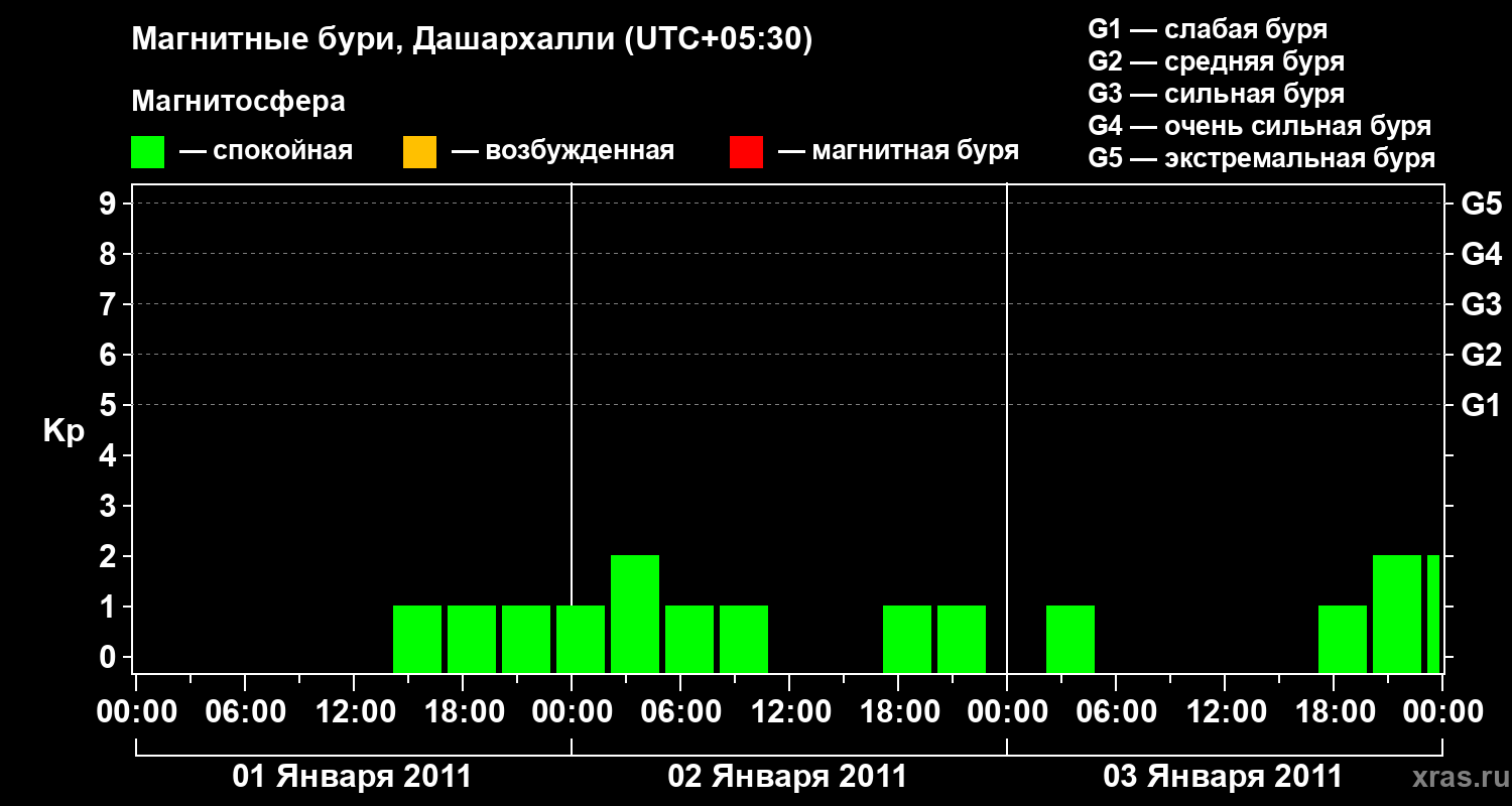 Изменения геомагнитного индекса Kp с 1 по 3 января 2011 года для средних широт