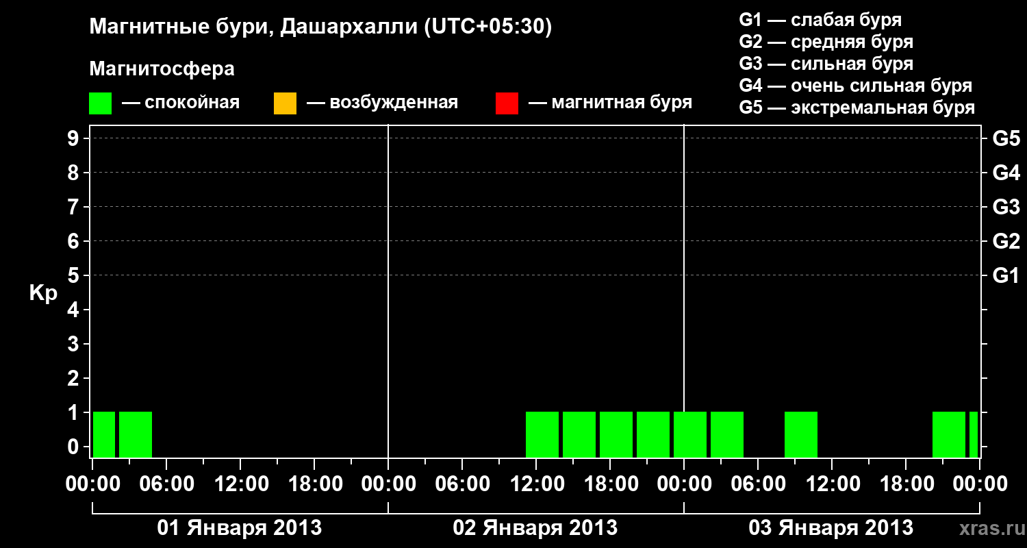 Изменения геомагнитного индекса Kp с 1 по 3 января 2013 года для средних широт