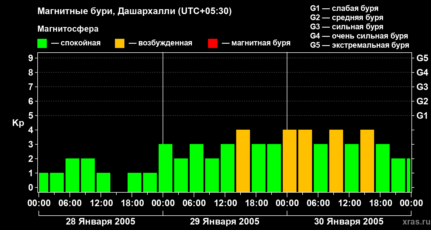 Изменения геомагнитного индекса Kp с 28 по 30 января 2005 года для средних широт