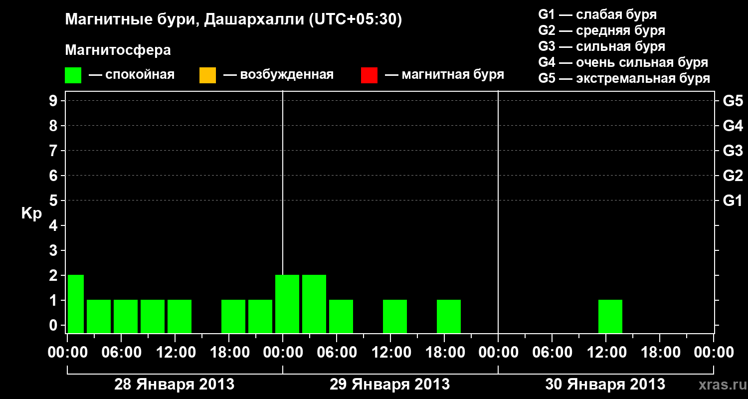 Изменения геомагнитного индекса Kp с 28 по 30 января 2013 года для средних широт