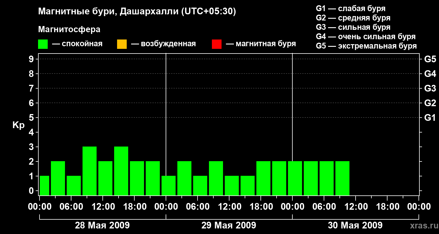 Изменения геомагнитного индекса Kp с 28 по 30 мая 2009 года для средних широт