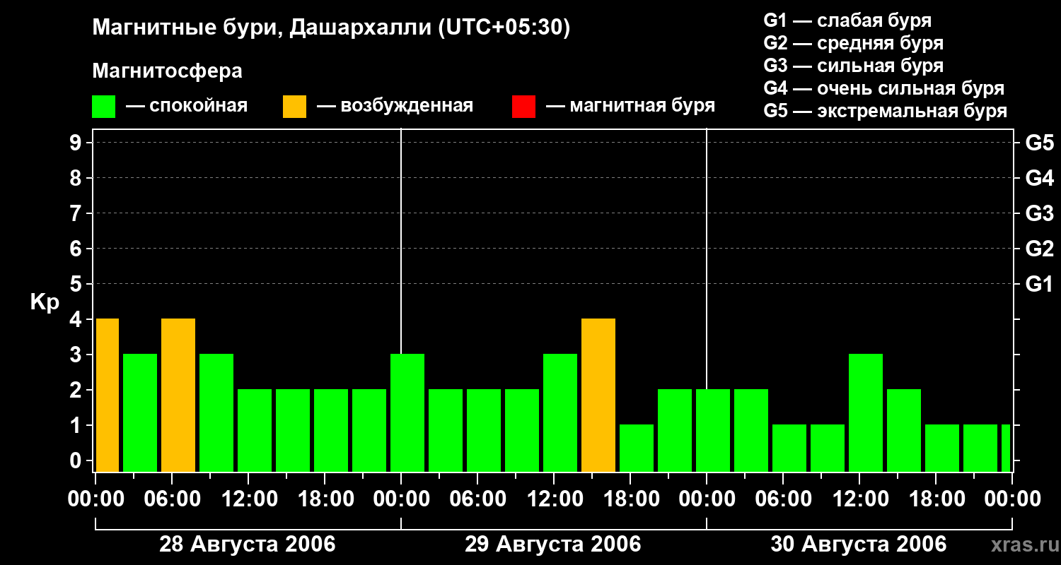 Изменения геомагнитного индекса Kp с 28 по 30 августа 2006 года для средних широт
