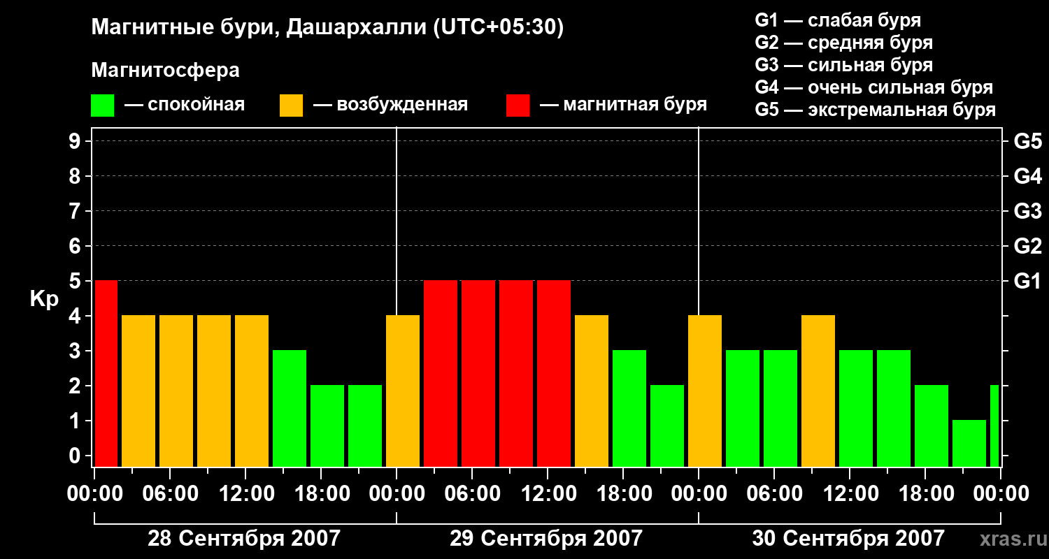 Изменения геомагнитного индекса Kp с 28 по 30 сентября 2007 года для средних широт