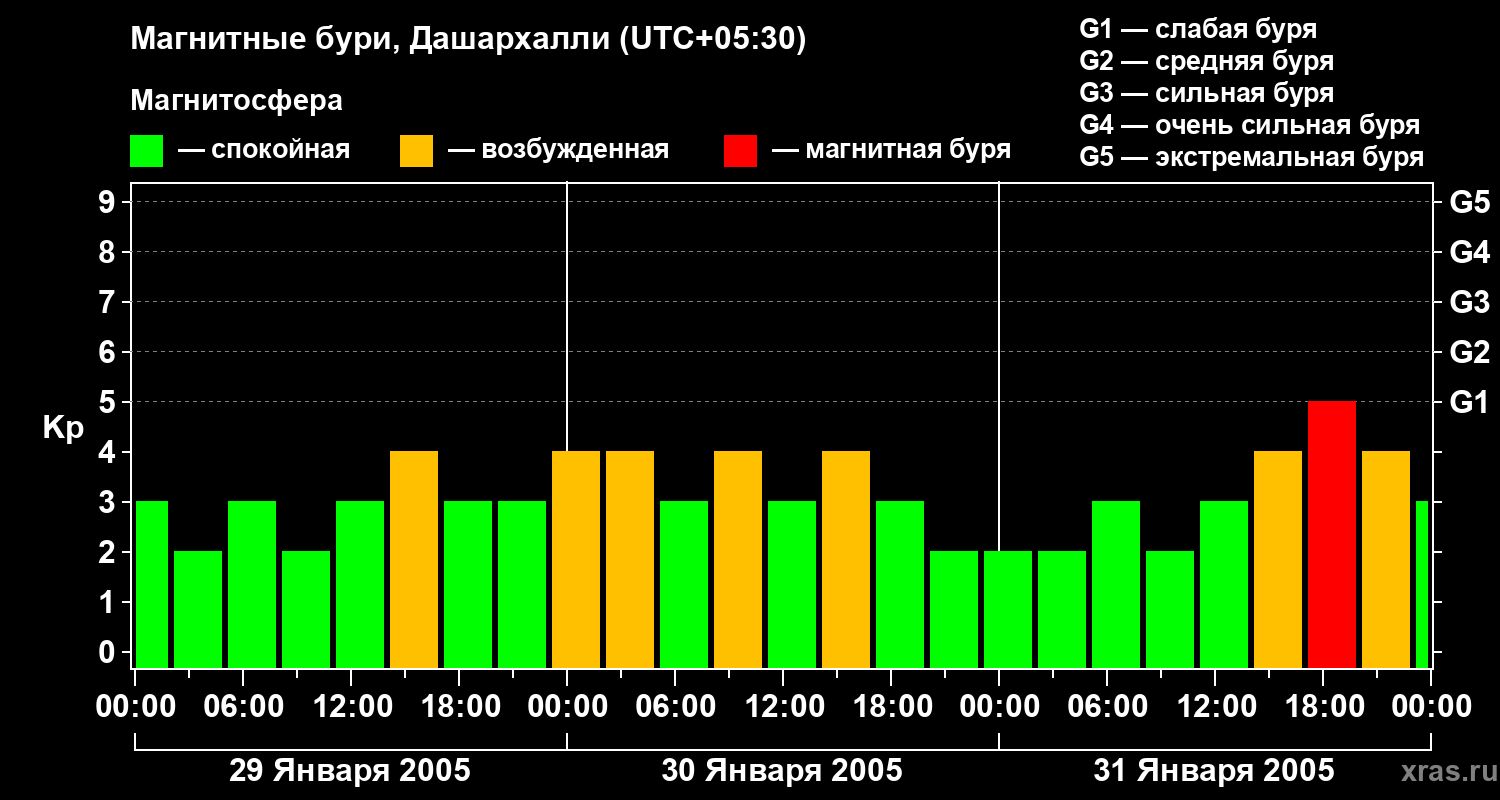 Изменения геомагнитного индекса Kp с 29 по 31 января 2005 года для средних широт