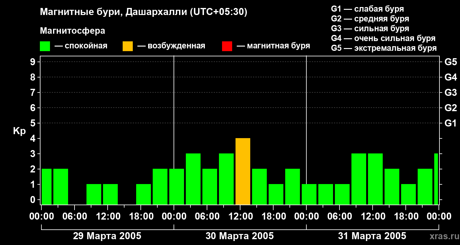 Изменения геомагнитного индекса Kp с 29 по 31 марта 2005 года для средних широт