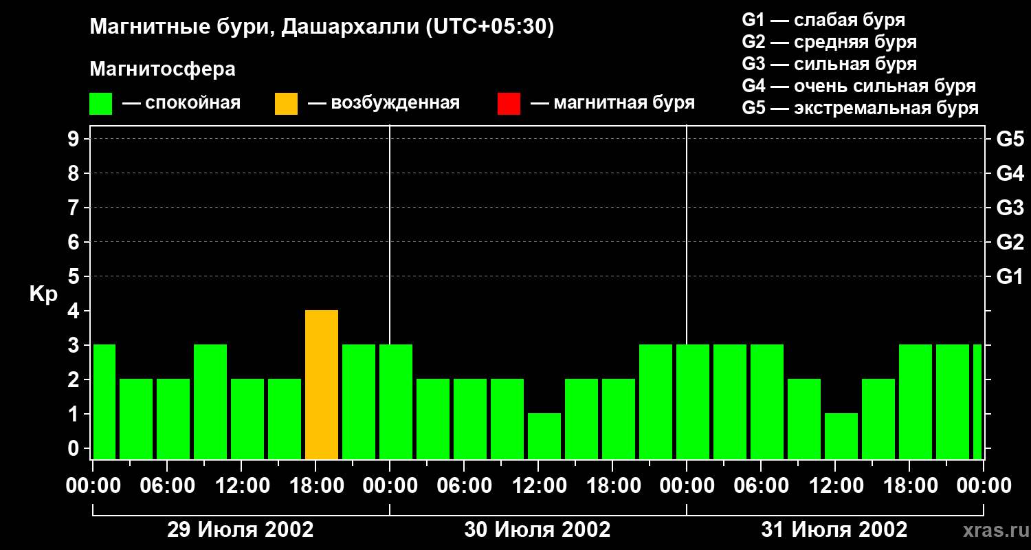 Изменения геомагнитного индекса Kp с 29 по 31 июля 2002 года для средних широт