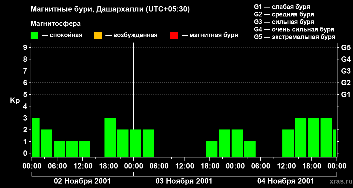 Изменения геомагнитного индекса Kp с 2 по 4 ноября 2001 года для средних широт
