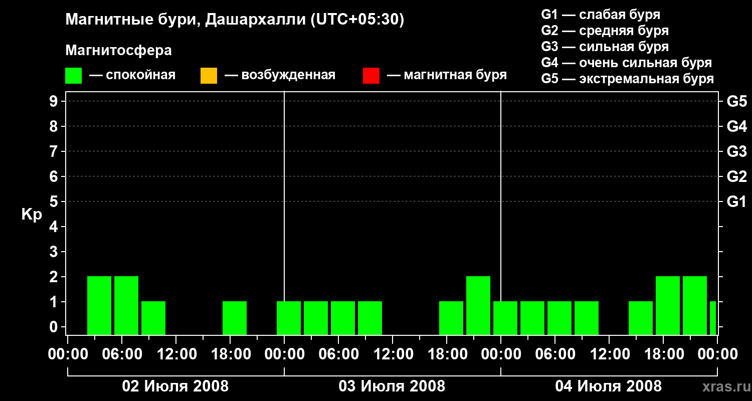 Изменения геомагнитного индекса Kp с 2 по 4 июля 2008 года для средних широт