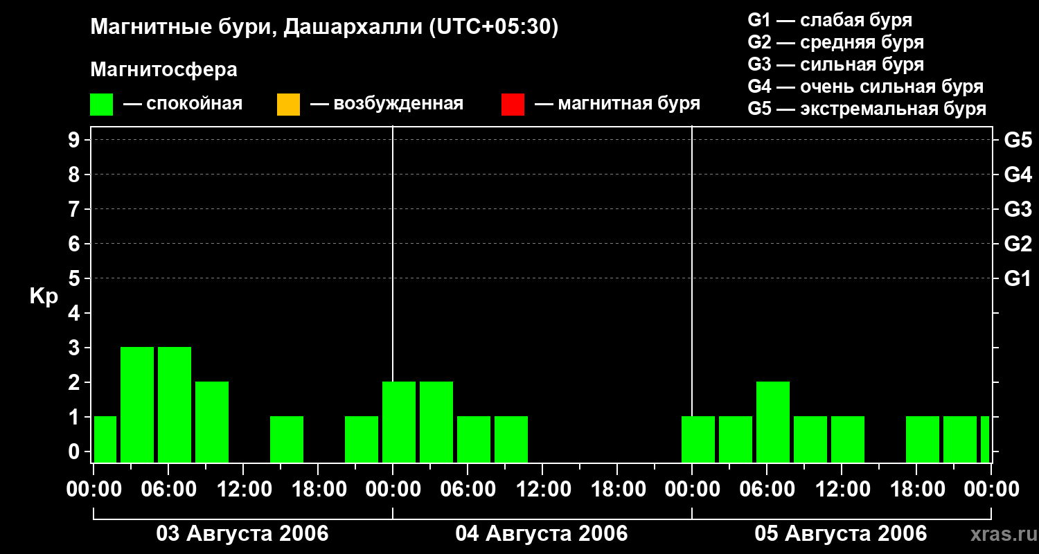 Изменения геомагнитного индекса Kp с 3 по 5 августа 2006 года для средних широт