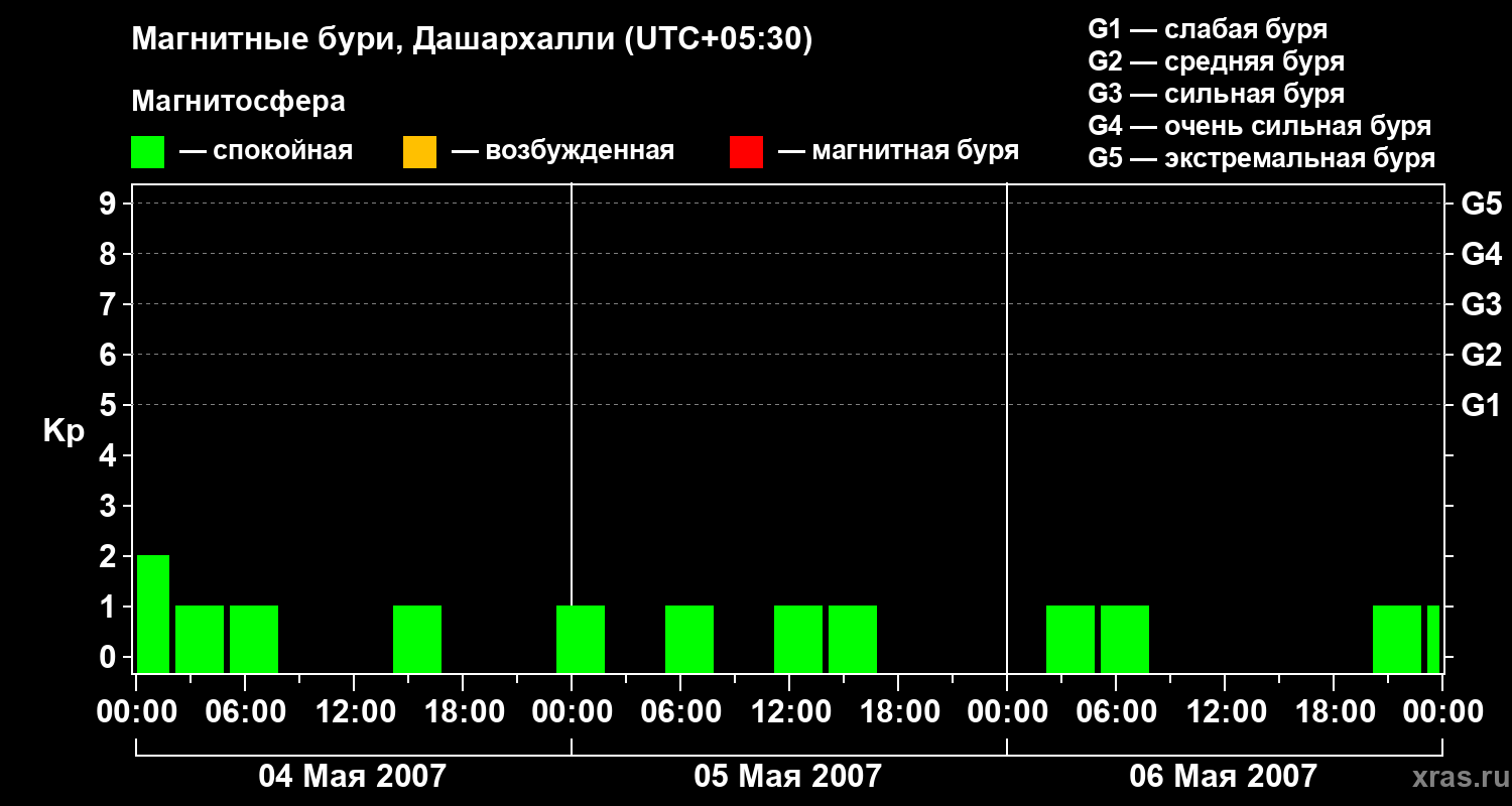 Изменения геомагнитного индекса Kp с 4 по 6 мая 2007 года для средних широт