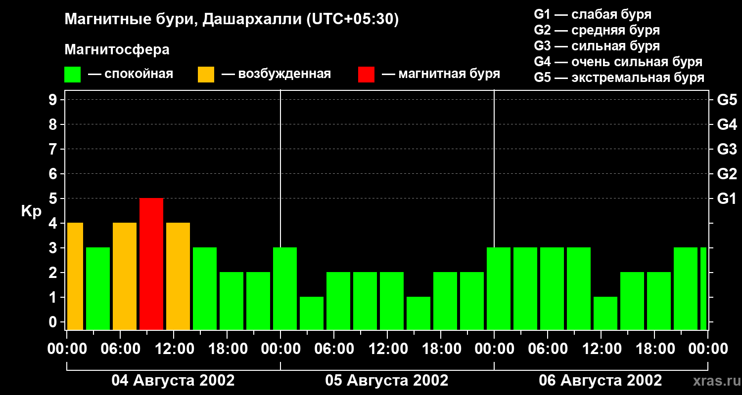 Изменения геомагнитного индекса Kp с 4 по 6 августа 2002 года для средних широт