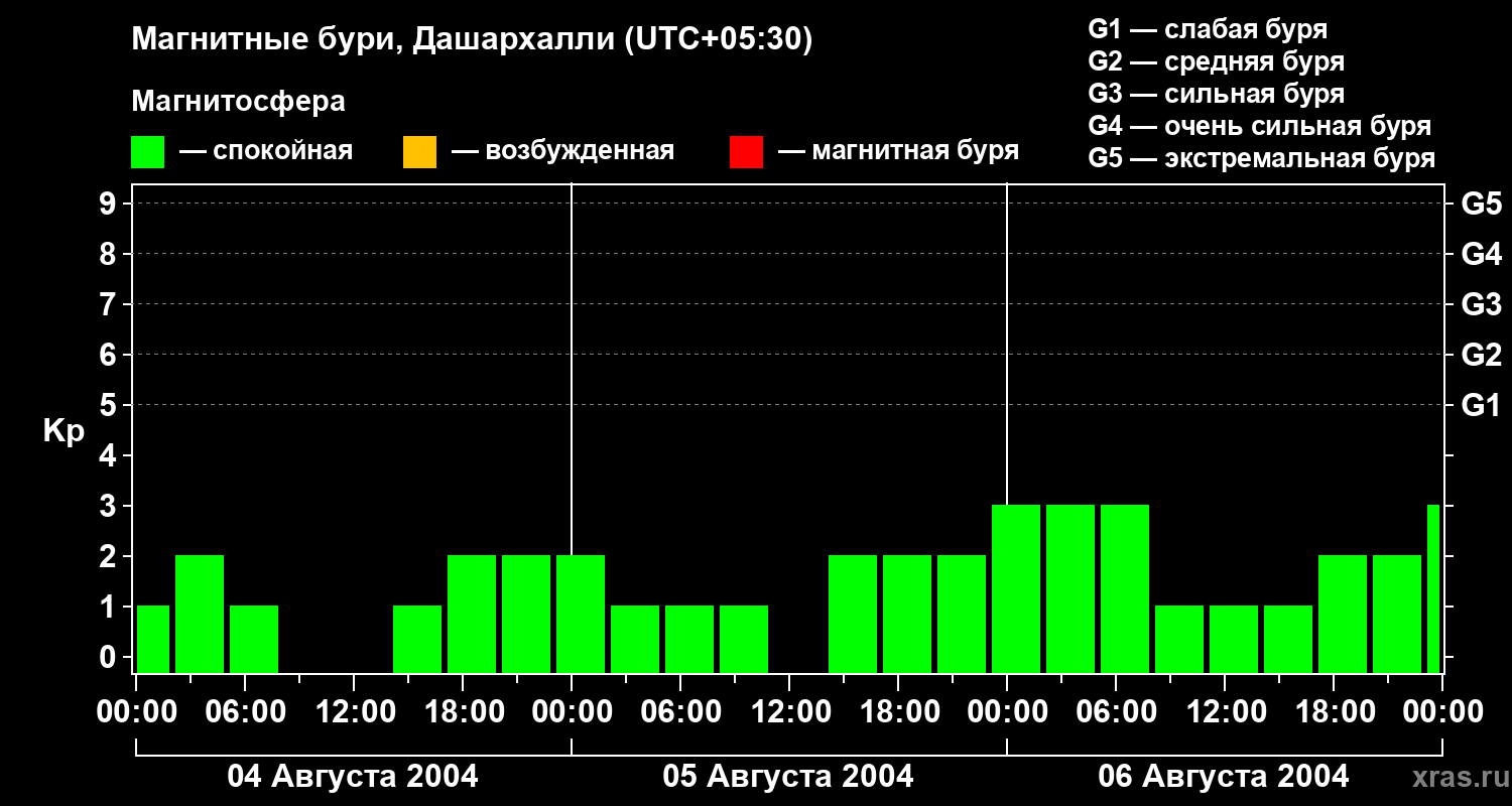 Изменения геомагнитного индекса Kp с 4 по 6 августа 2004 года для средних широт