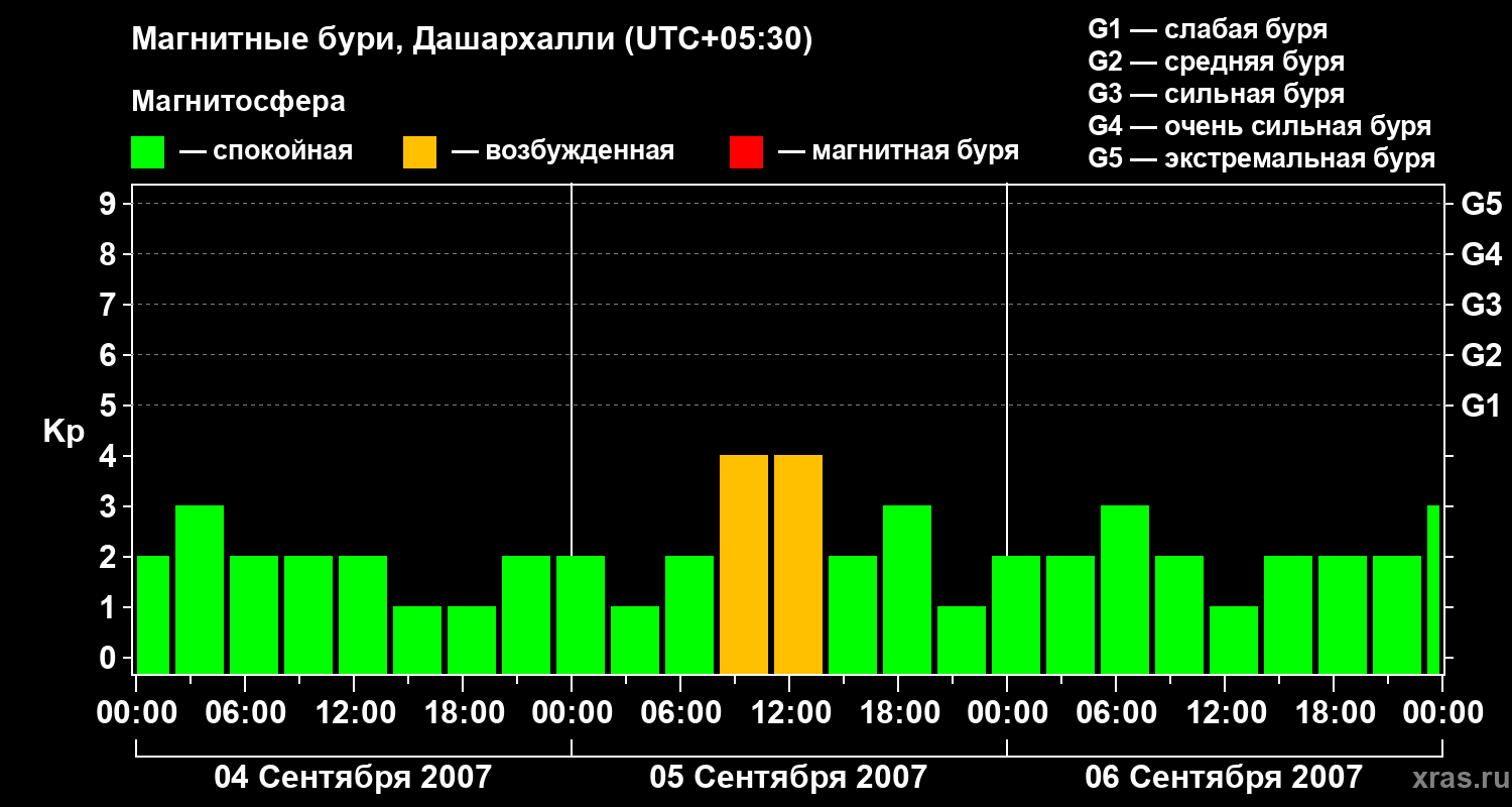 Изменения геомагнитного индекса Kp с 4 по 6 сентября 2007 года для средних широт