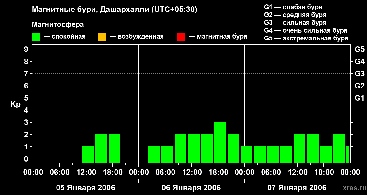 Изменения геомагнитного индекса Kp с 5 по 7 января 2006 года для средних широт
