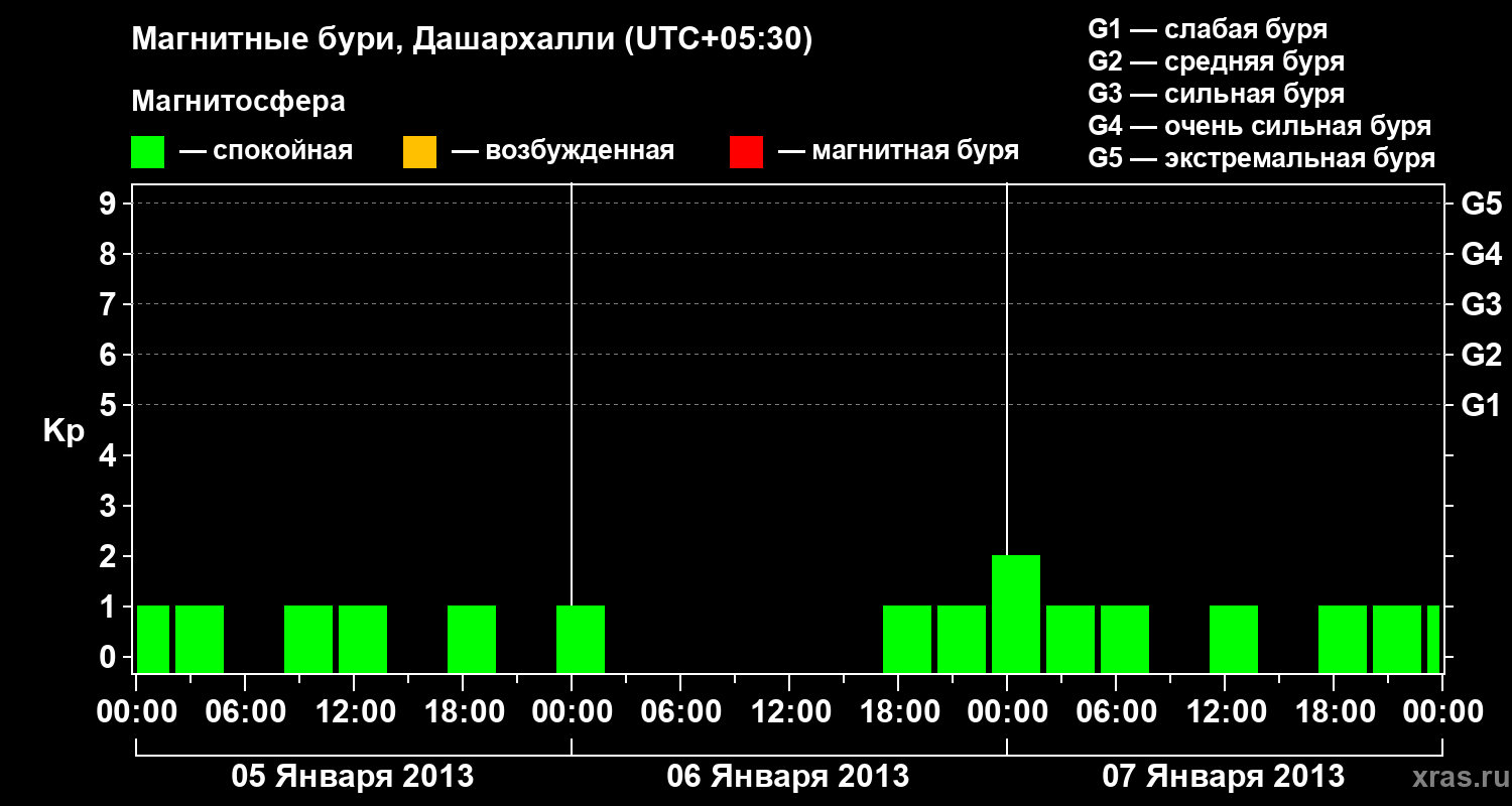 Изменения геомагнитного индекса Kp с 5 по 7 января 2013 года для средних широт