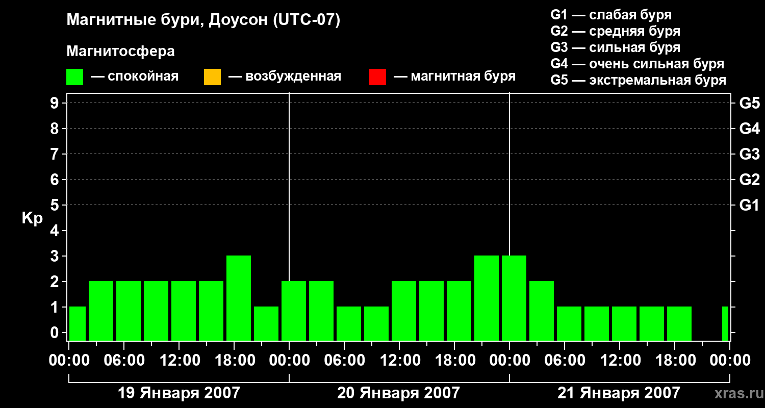 Изменения геомагнитного индекса Kp с 19 по 21 января 2007 года для средних широт