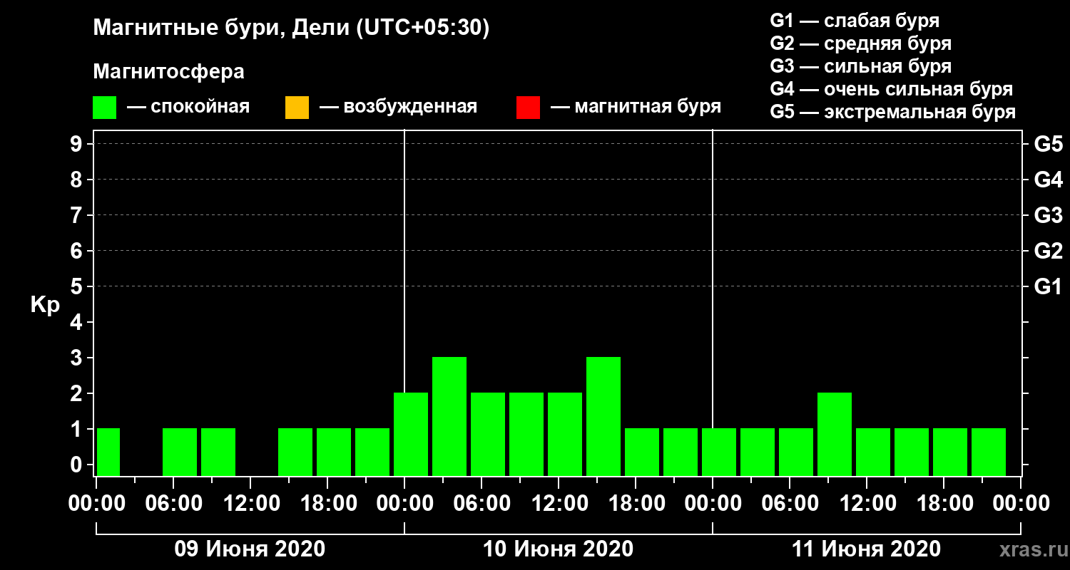 Изменения геомагнитного индекса Kp с 9 по 11 июня 2020 года для средних широт