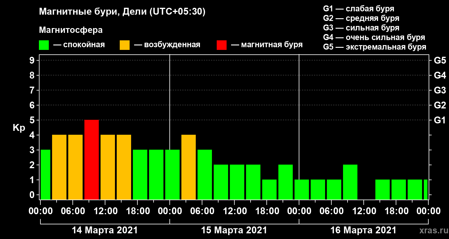 Изменения геомагнитного индекса Kp с 14 по 16 марта 2021 года для средних широт