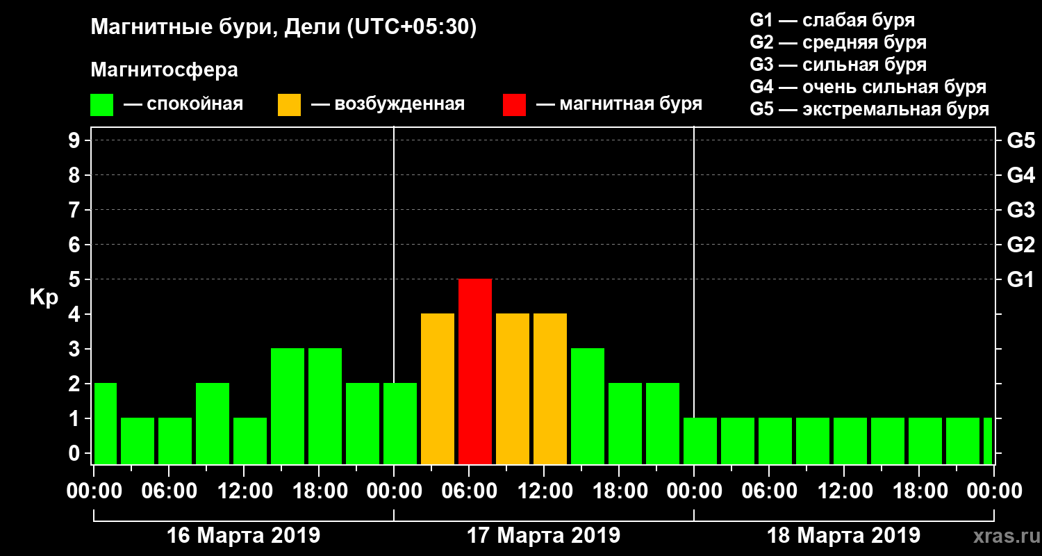 Изменения геомагнитного индекса Kp с 16 по 18 марта 2019 года для средних широт