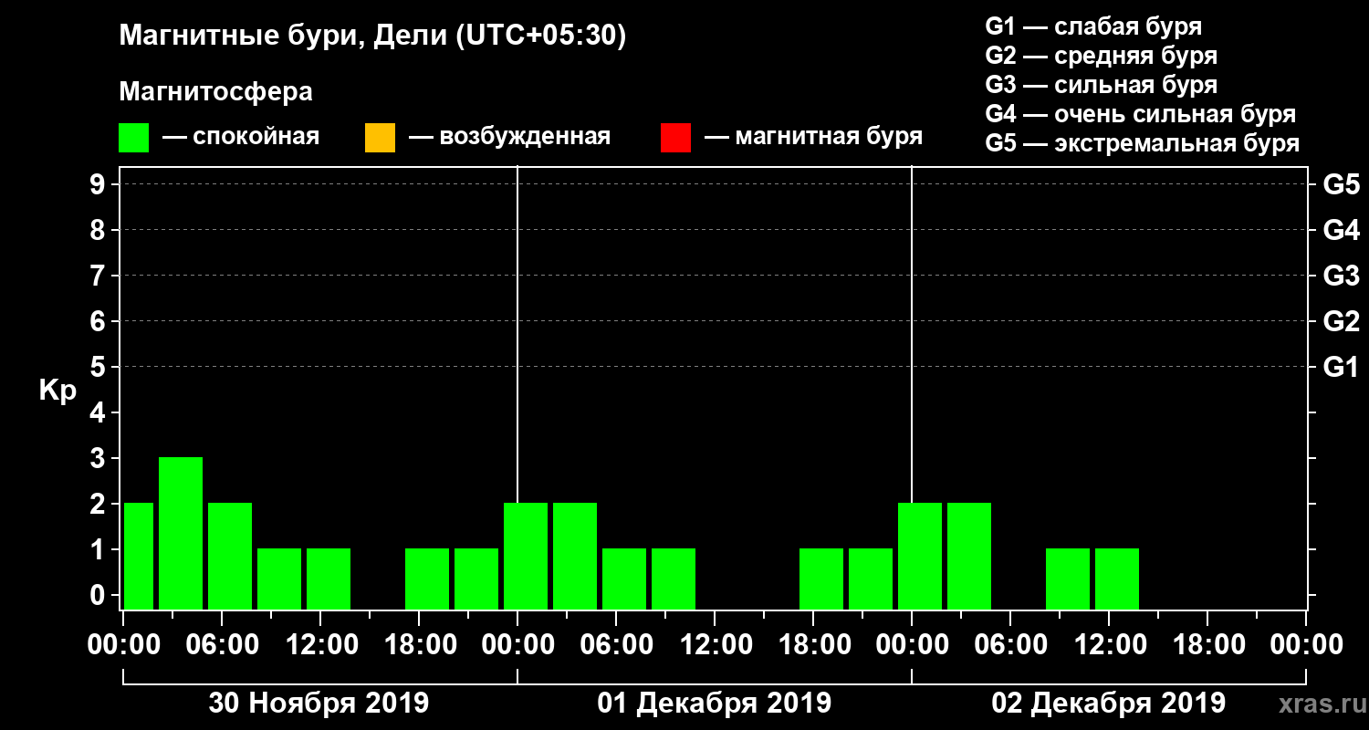 Изменения геомагнитного индекса Kp с 30 ноября по 2 декабря 2019 года для средних широт