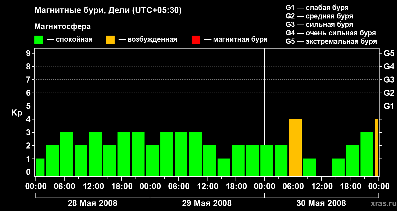 Изменения геомагнитного индекса Kp с 28 по 30 мая 2008 года для средних широт