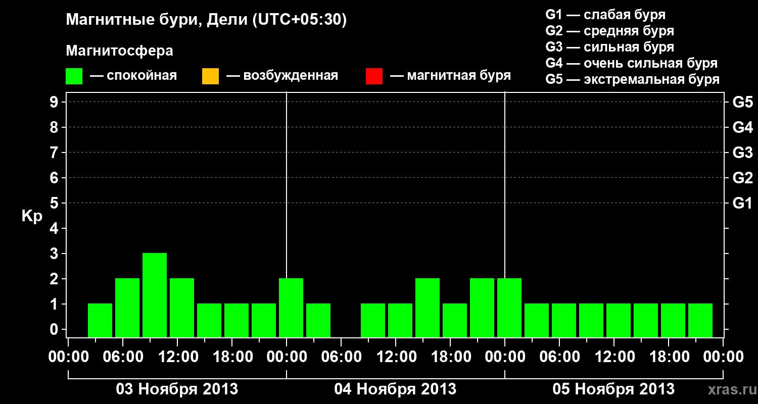 Изменения геомагнитного индекса Kp с 3 по 5 ноября 2013 года для средних широт
