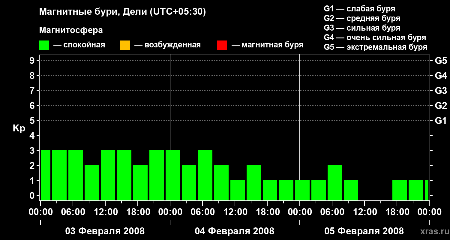 Изменения геомагнитного индекса Kp с 3 по 5 февраля 2008 года для средних широт