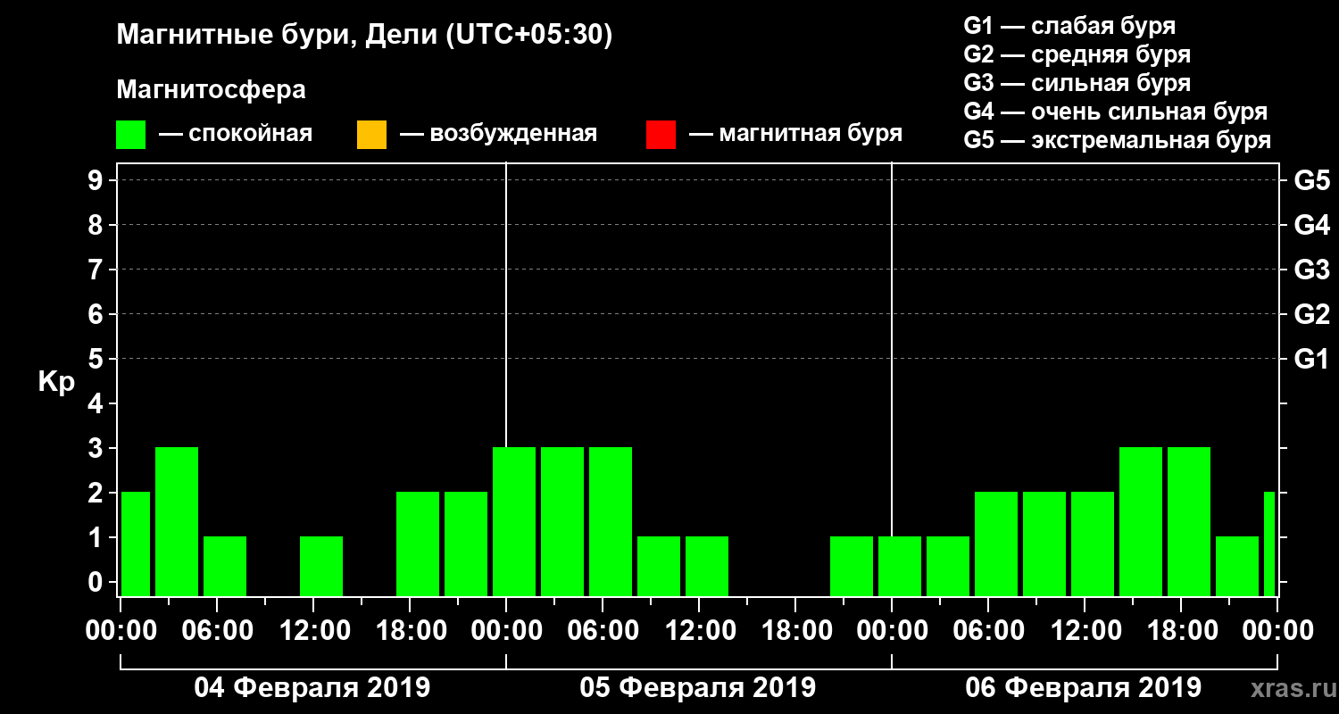 Изменения геомагнитного индекса Kp с 4 по 6 февраля 2019 года для средних широт