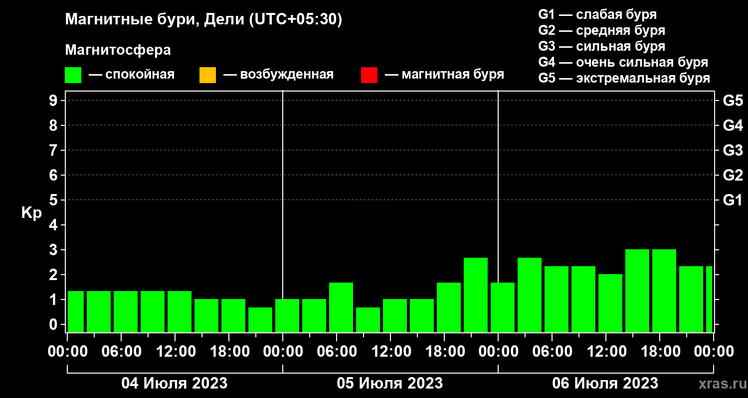 Изменения геомагнитного индекса Kp с 4 по 6 июля 2023 года для средних широт