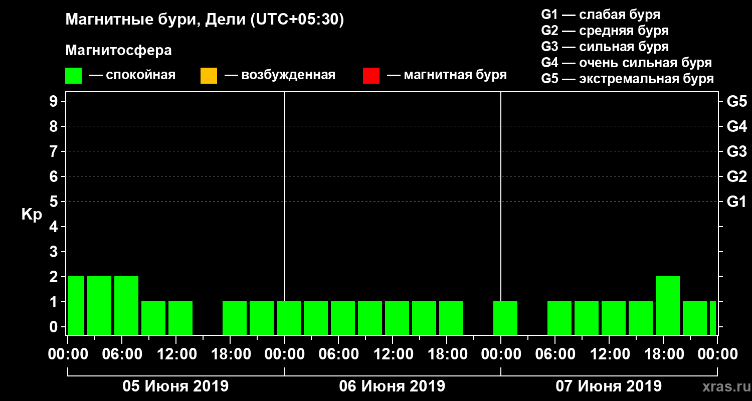 Изменения геомагнитного индекса Kp с 5 по 7 июня 2019 года для средних широт
