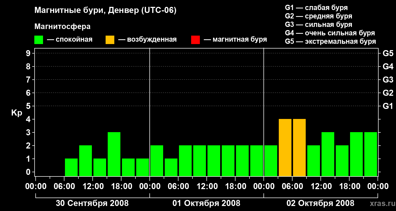 Изменения геомагнитного индекса Kp с 30 сентября по 2 октября 2008 года для средних широт