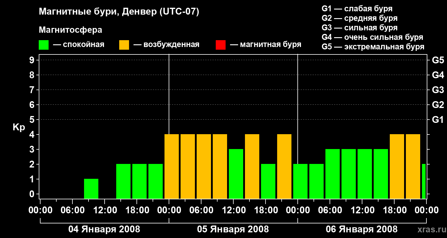 Изменения геомагнитного индекса Kp с 4 по 6 января 2008 года для средних широт