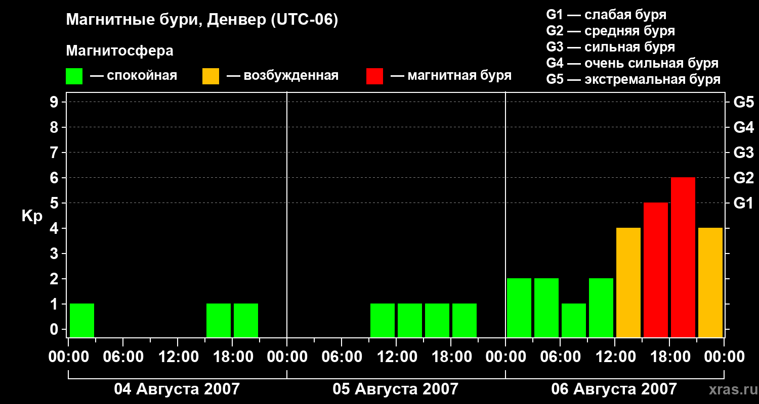Изменения геомагнитного индекса Kp с 4 по 6 августа 2007 года для средних широт