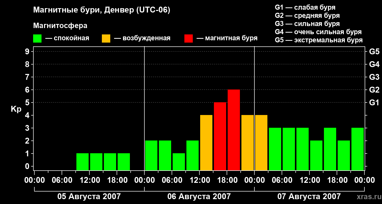 Изменения геомагнитного индекса Kp с 5 по 7 августа 2007 года для средних широт