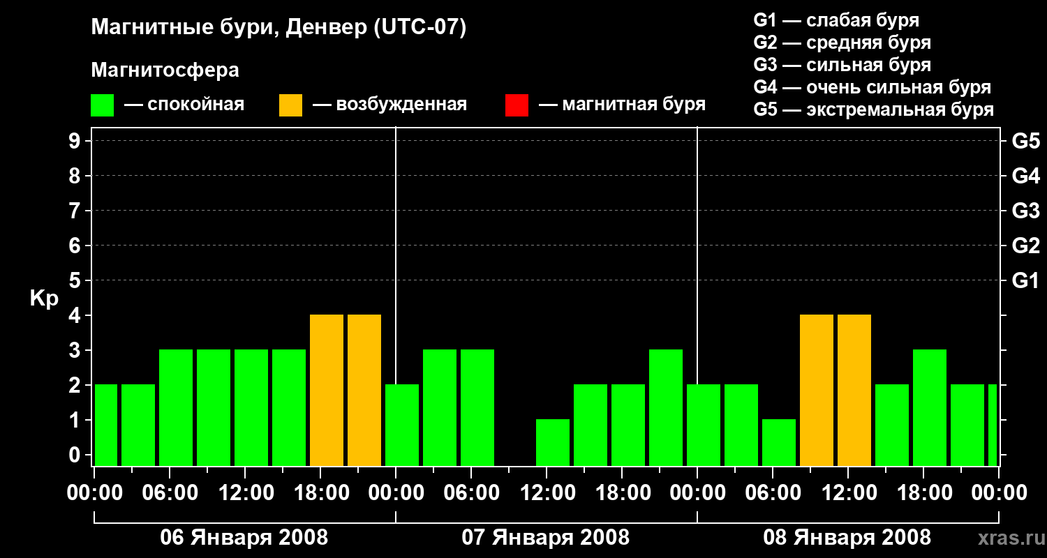 Изменения геомагнитного индекса Kp с 6 по 8 января 2008 года для средних широт