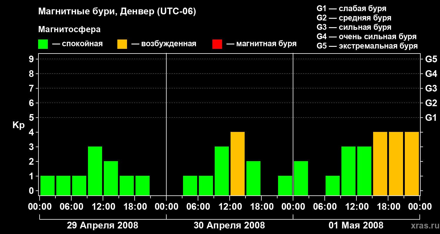Изменения геомагнитного индекса Kp с 29 апреля по 1 мая 2008 года для средних широт